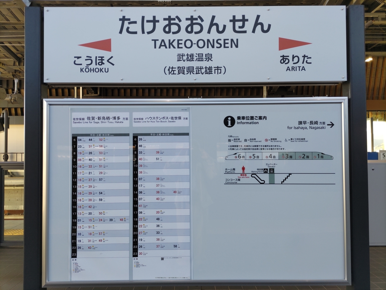 「武雄温泉」は北側が在来線・南側が新幹線の高架駅で乗り場は以下の通りです。